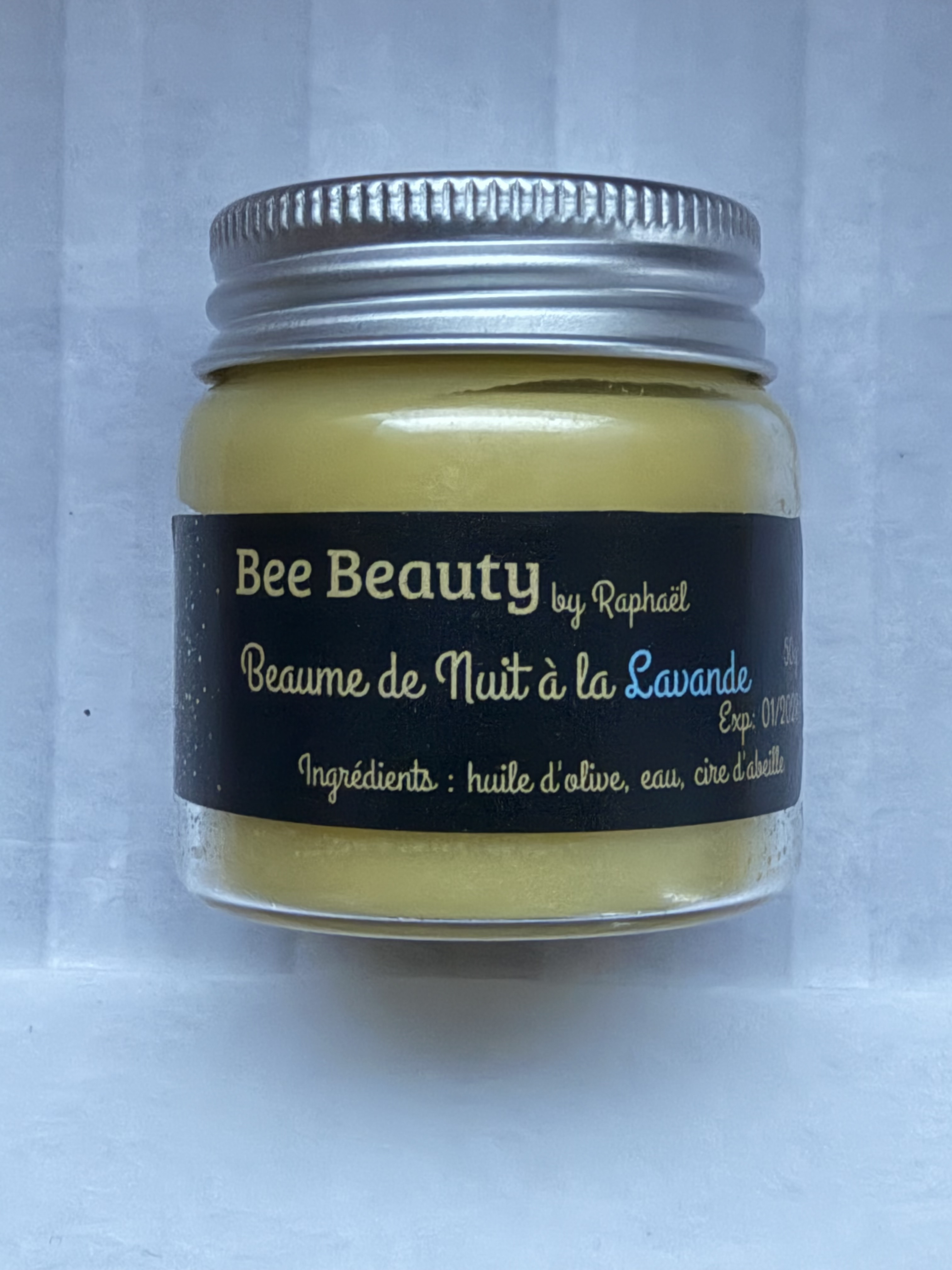 Baume de Nuit à la Lavande fait à partir de cire d'abeille, d'huile d'olive bio, d'eau de source de montagne et avec une touche d'essence essentielle à la Lavande.